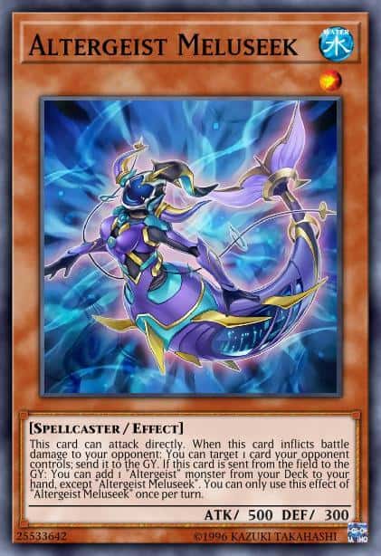 This card can attack directly. When this card inflicts battle damage to your opponent: You can target 1 card your opponent controls; send it to the GY. If this card is sent from the field to the GY: You can add 1 “Altergeist” monster from your Deck to your hand, except “Altergeist Meluseek”. You can only use this effect of “Altergeist Meluseek” once per turn.