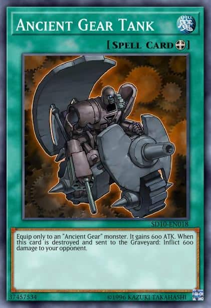 Equip only to an “Ancient Gear” monster. It gains 600 ATK. When this card is destroyed and sent to the Graveyard: Inflict 600 damage to your opponent.