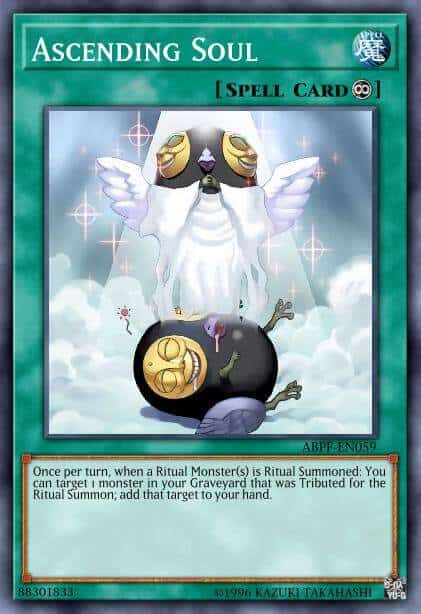 Once per turn, when a Ritual Monster(s) is Ritual Summoned: You can target 1 monster in your Graveyard that was Tributed for the Ritual Summon; add that target to your hand.