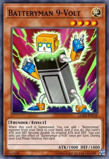 When this card is Summoned: You can add 1 “Batteryman” monster from your Deck to your hand, and if you do, this card’s ATK and DEF become double its original ATK and DEF. You can only use this effect of “Batteryman 9-Volt” once per turn. During your End Phase: Destroy this card.