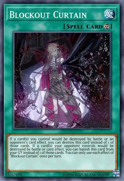 If a card(s) you control would be destroyed by battle or an opponent’s card effect, you can destroy this card instead of 1 of those cards. If a card(s) your opponent controls would be destroyed by battle or card effect, you can banish this card from your GY instead of 1 of those cards. You can only use each effect of “Blockout Curtain” once per turn.