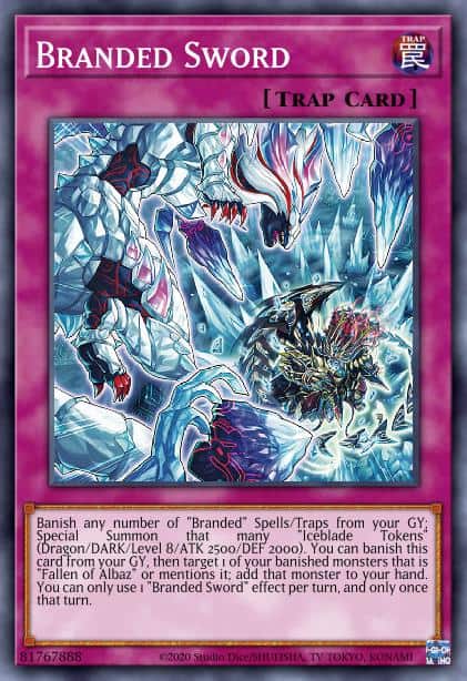 Banish any number of “Branded” Spells/Traps from your GY; Special Summon that many “Iceblade Tokens” (Dragon/DARK/Level 8/ATK 2500/DEF 2000). You can banish this card from your GY, then target 1 of your banished monsters that is “Fallen of Albaz” or mentions it; add that monster to your hand. You can only use 1 “Branded Sword” effect per turn, and only once that turn.