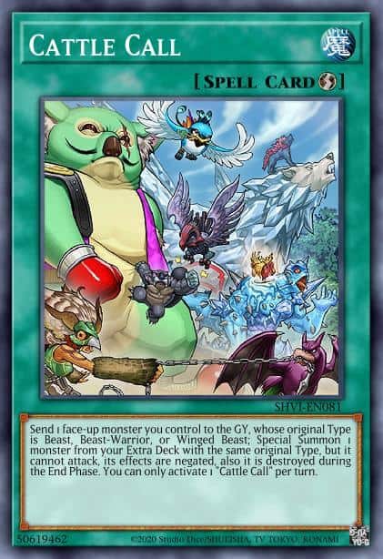 Send 1 face-up monster you control to the Graveyard, whose original Type is Beast, Beast-Warrior, or Winged Beast; Special Summon 1 monster from your Extra Deck with the same original Type, but it cannot attack, its effects are negated, also it is destroyed during the End Phase. You can only activate 1 “Cattle Call” per turn.