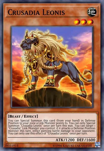 You can Special Summon this card (from your hand) in Defense Position to your zone a Link Monster points to. You can only Special Summon “Crusadia Leonis” once per turn this way. You can target 1 “Crusadia” Link Monster you control; if it attacks a Defense Position monster this turn, inflict piercing battle damage to your opponent. You can only use this effect of “Crusadia Leonis” once per turn.