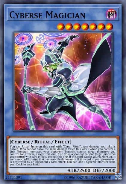 You can Ritual Summon this card with “Cynet Ritual”. Any damage you take is halved. (You cannot halve the same damage twice this way.) While you control a Link Monster, monsters your opponent controls cannot target monsters you control for attacks, except this one, also your opponent cannot target monsters you control with card effects, except this one. If this card battles a Link Monster, it gains 1000 ATK during that damage calculation only. If this card in your possession is destroyed by an opponent’s card effect: You can add 1 Cyberse monster from your Deck to your hand.