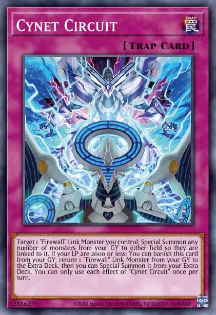 Target 1 “Firewall” Link Monster you control; Special Summon any number of monsters from your GY to either field so they are linked to it. If your LP are 2000 or less: You can banish this card from your GY; return 1 “Firewall” Link Monster from your GY to the Extra Deck, then you can Special Summon it from your Extra Deck. You can only use each effect of “Cynet Circuit” once per turn.