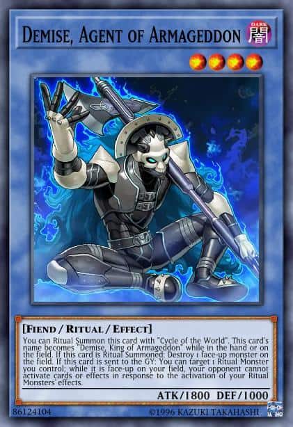 You can Ritual Summon this card with “Cycle of the World”. This card’s name becomes “Demise, King of Armageddon” while in the hand or on the field. If this card is Ritual Summoned: Destroy 1 face-up monster on the field. If this card is sent to the GY: You can target 1 Ritual Monster you control; while it is face-up on your field, your opponent cannot activate cards or effects in response to the activation of your Ritual Monsters’ effects.