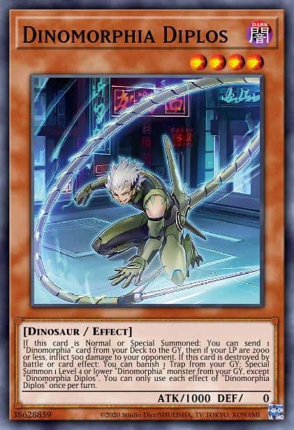 If this card is Normal or Special Summoned: You can send 1 “Dinomorphia” card from your Deck to the GY, then if your LP are 2000 or less, inflict 500 damage to your opponent. If this card is destroyed by battle or card effect: You can banish 1 Trap from your GY; Special Summon 1 Level 4 or lower “Dinomorphia” monster from your GY, except “Dinomorphia Diplos”. You can only use each effect of “Dinomorphia Diplos” once per turn.