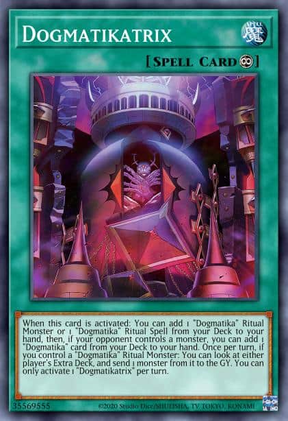 When this card is activated: You can add 1 “Dogmatika” Ritual Monster or 1 “Dogmatika” Ritual Spell from your Deck to your hand, then if your opponent controls a monster, you can add 1 “Dogmatika” card from your Deck to your hand. Once per turn, if you control a “Dogmatika” Ritual Monster: You can look at either player’s Extra Deck, and send 1 monster from it to the GY. You can only activate 1 “Dogmatikamatrix” per turn.