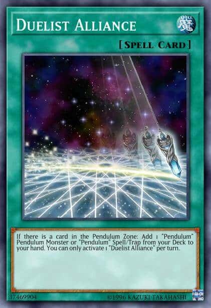 If there is a card in the Pendulum Zone: Add 1 “Pendulum” Pendulum Monster or “Pendulum” Spell/Trap from your Deck to your hand. You can only activate 1 “Duelist Alliance” per turn.