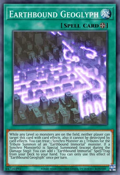 While any Level 10 monsters are on the field, this card cannot be targeted or destroyed by card effects. You can treat 1 Synchro Monster as 2 Tributes for the Tribute Summon of an “Earthbound Immortal” monster. If a Synchro Monster(s) is Special Summoned (except during the Damage Step): You can add 1 “Earthbound Immortal” Spell/Trap from your Deck to your hand. You can only use this effect of “Earthbound Geoglyph” once per turn.