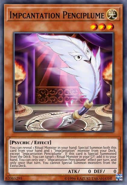 You can reveal 1 Ritual Monster in your hand; Special Summon both this card from your hand and 1 “Impcantation” monster from your Deck, except “Impcantation Penciplume”. If this card is Special Summoned from the Deck: You can target 1 Ritual Monster in your GY; add it to your hand. You can only use 1 “Impcantation Penciplume” effect per turn, and only once that turn. You cannot Special Summon monsters from the Extra Deck.