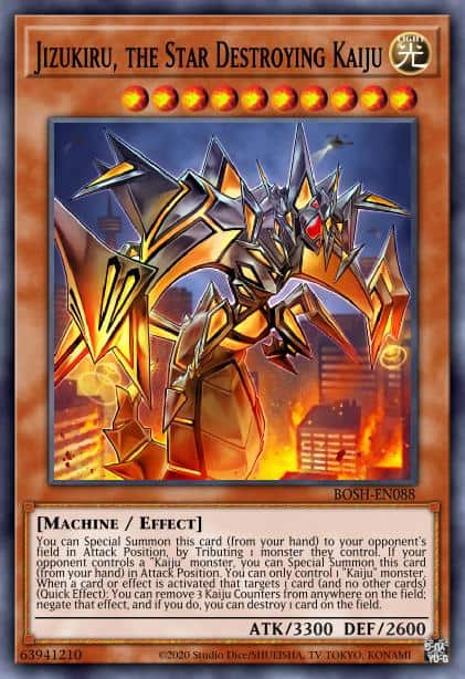 You can Special Summon this card (from your hand) to your opponent’s field in Attack Position, by Tributing 1 monster they control. If your opponent controls a “Kaiju” monster, you can Special Summon this card (from your hand) in Attack Position. You can only control 1 “Kaiju” monster. When a card or effect is activated that targets exactly 1 card (and no other cards) (Quick Effect): You can remove 3 Kaiju Counters from anywhere on the field; negate that effect, and if you do, you can destroy 1 card on the field.