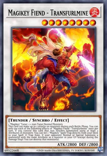 This card can make up to 2 attacks on monsters during each Battle Phase. You can only use each of the following effects of “Magikey Fiend – Transfurlmine” once per turn. If you control this card that was Synchro Summoned using at least 2 Attributes of monsters: You can Set 1 “Magikey” Spell/Trap directly from your Deck to your Spell & Trap Zone. If your opponent Normal or Special Summons a monster(s) with the same Attribute as a monster in your GY (except during the Damage Step): You can destroy that monster(s).