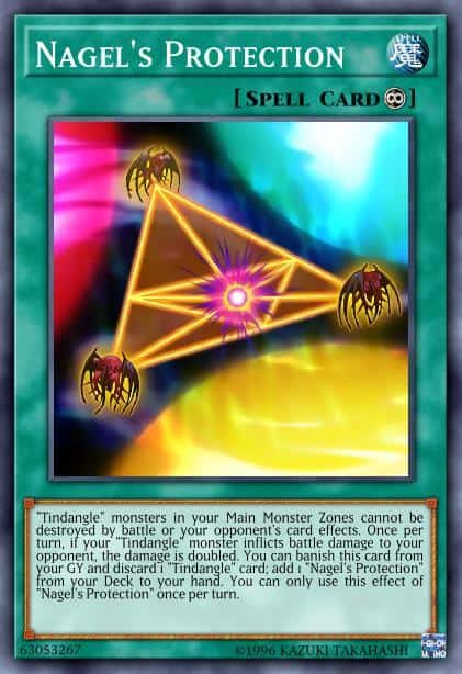 “Tindangle” monsters in your Main Monster Zones cannot be destroyed by battle or your opponent’s card effects. Once per turn, if your “Tindangle” monster inflicts battle damage to your opponent, the damage is doubled. You can banish this card from your GY and discard 1 “Tindangle” card; add 1 “Nagel’s Protection” from your Deck to your hand. You can only use this effect of “Nagel’s Protection” once per turn.