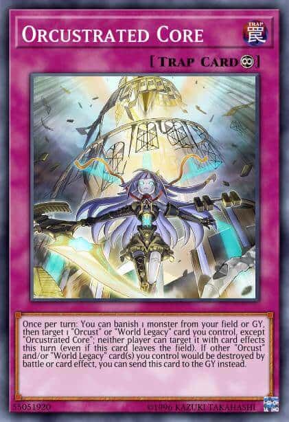 Once per turn: You can banish 1 monster from your field or GY, then target 1 “Orcust” or “World Legacy” card you control, except “Orcustrated Core”; neither player can target it with card effects this turn (even if this card leaves the field). If other “Orcust” and/or “World Legacy” card(s) you control would be destroyed by battle or card effect, you can send this card to the GY instead.