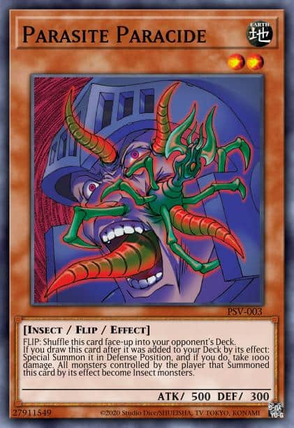 FLIP: Put this card face-up in your opponent’s Deck and shuffle it. When your opponent draws this card, it is Special Summoned to their side of the field in face-up Defense Position, and inflicts 1000 damage to them. Then, while this card is face-up on the field, all monsters your opponent controls become Insect-Type monsters.
