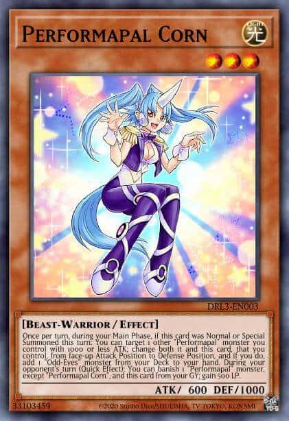 Once per turn, during your Main Phase, if this card was Normal or Special Summoned this turn: You can target 1 other “Performapal” monster you control with 1000 or less ATK; change both it and this card, that you control, from face-up Attack Position to Defense Position, and if you do, add 1 “Odd-Eyes” monster from your Deck to your hand. During your opponent’s turn: You can banish 1 “Performapal” monster, except “Performapal Corn”, and this card from your Graveyard; gain 500 LP (this is a Quick Effect).
