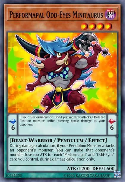 During damage calculation, if your Pendulum Monster attacks an opponent’s monster: You can make that opponent’s monster lose 100 ATK for each “Performapal” and “Odd-Eyes” card you control, during damage calculation only.