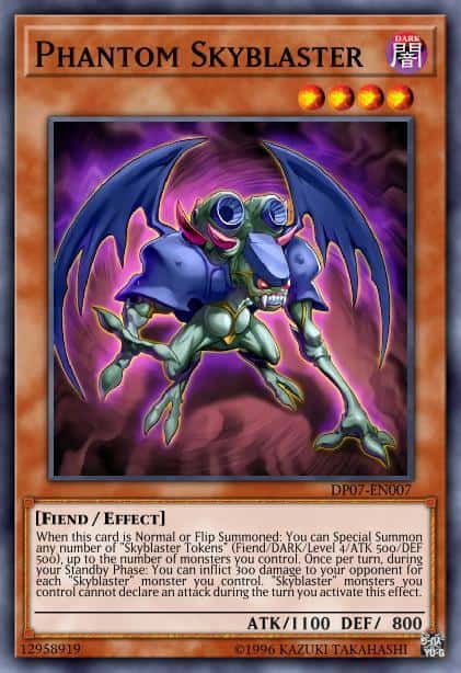 When this card is Normal or Flip Summoned: You can Special Summon any number of “Skyblaster Tokens” (Fiend/DARK/Level 4/ATK 500/DEF 500), up to the number of monsters you control. Once per turn, during your Standby Phase: You can inflict 300 damage to your opponent for each “Skyblaster” monster you control. “Skyblaster” monsters you control cannot declare an attack during the turn you activate this effect.