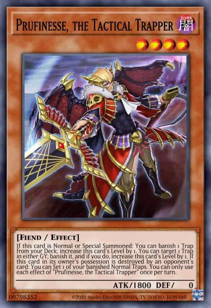 If this card is Normal or Special Summoned: You can banish 1 Trap from your Deck; increase this card’s Level by 1. You can target 1 Trap in either GY; banish it, and if you do, increase this card’s Level by 1. If this card in its owner’s possession is destroyed by an opponent’s card: You can Set 1 of your banished Normal Traps. You can only use each effect of “Prufinesse, the Tactical Trapper” once per turn.