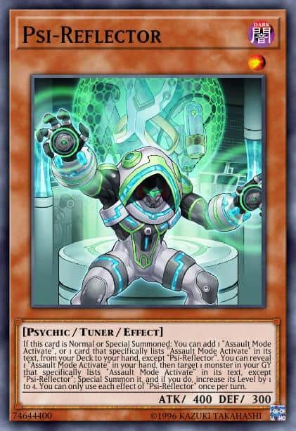 If this card is Normal or Special Summoned: You can add 1 “Assault Mode Activate”, or 1 card that specifically lists “Assault Mode Activate” in its text, from your Deck to your hand, except “Psi-Reflector”. You can reveal 1 “Assault Mode Activate” in your hand, then target 1 monster in your GY that specifically lists “Assault Mode Activate” in its text, except “Psi-Reflector”; Special Summon it, and if you do, increase its Level by 1 to 4. You can only use each effect of “Psi-Reflector” once per turn.