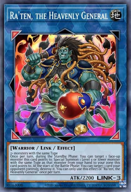 Once per turn, during the Standby Phase: You can target 1 face-up monster this card points to; Special Summon 1 Level 4 or lower monster with the same Type as that monster from your hand to your zone this card points to. At the start of the Battle Phase: You can target 1 card your opponent controls; destroy it. You can only use this effect of “Ra’ten, the Heavenly General” once per turn.