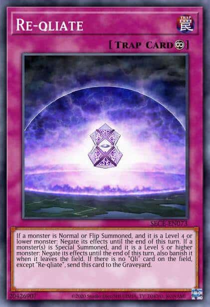 If a monster is Normal or Flip Summoned, and it is a Level 4 or lower monster: Negate its effects until the end of this turn. If a monster(s) is Special Summoned, and it is a Level 5 or higher monster: Negate its effects until the end of this turn, also banish it when it leaves the field. If there is no “Qli” card on the field, except “Re-qliate”, send this card to the Graveyard.