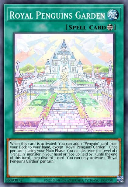When this card is activated: You can add 1 “Penguin” card from your Deck to your hand, except “Royal Penguins Garden”. Once per turn, during your Main Phase: You can decrease the Level of 1 “Penguin” monster in your hand or face-up field by 1 (until the end of this turn), then discard 1 card. You can only activate 1 “Royal Penguins Garden” per turn.