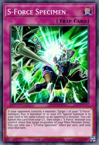 If your opponent controls a monster: Target 1 of your “S-Force” monsters that is banished or in your GY; Special Summon it to your field in the same column as an opponent’s monster. You can banish this card from your GY, then target 1 “S-Force” monster you control; move that target to another of your Main Monster Zones. You can only use 1 “S-Force Specimen” effect per turn, and only once that turn.