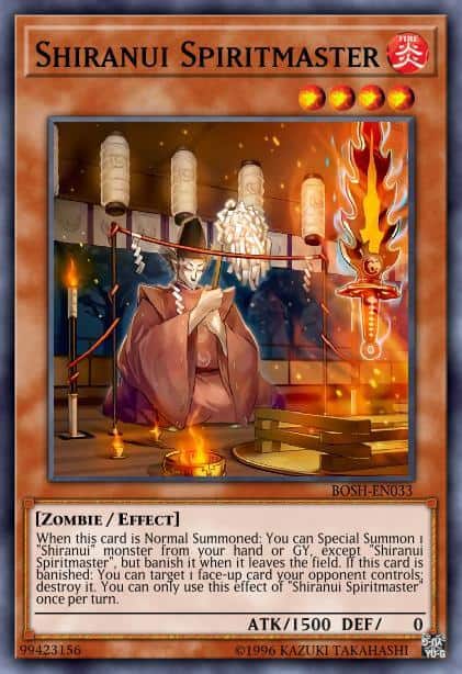 When this card is Normal Summoned: You can Special Summon 1 “Shiranui” monster from your hand or GY, except “Shiranui Spiritmaster”, but banish it when it leaves the field. If this card is banished: You can target 1 face-up card your opponent controls; destroy it. You can only use this effect of “Shiranui Spiritmaster” once per turn.