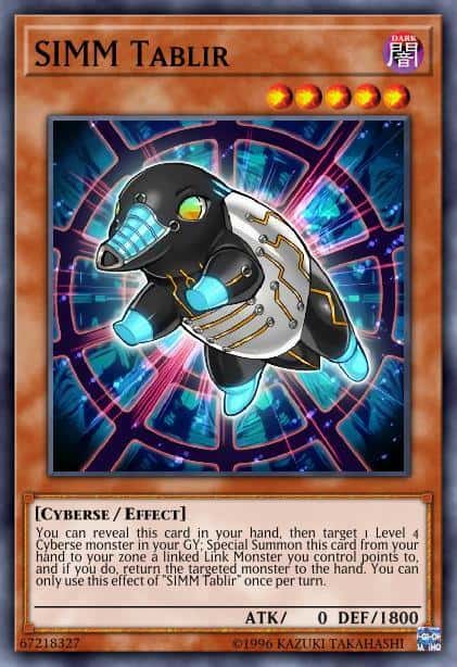 You can reveal this card in your hand, then target 1 Level 4 Cyberse monster in your GY; Special Summon this card from your hand to your zone a linked Link Monster you control points to, and if you do, return the targeted monster to the hand. You can only use this effect of “SIMM Tablir” once per turn.