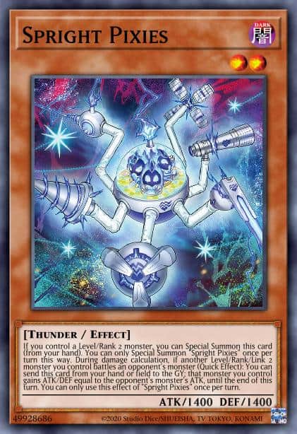 If you control a Level/Rank 2 monster, you can Special Summon this card (from your hand). You can only Special Summon “Spright Pixies” once per turn this way. During damage calculation, if another Level/Rank/Link 2 monster you control battles an opponent’s monster (Quick Effect): You can send this card from your hand or field to the GY; that monster you control gains ATK/DEF equal to that opponent’s monster’s ATK, until the end of this turn. You can only use this effect of “Spright Pixies” once per turn.