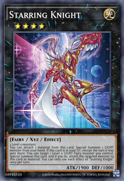 You can detach 1 material from this card; Special Summon 1 LIGHT monster from your hand. If this card is in your GY, except the turn it was sent there: You can target 1 Level 4 LIGHT Fairy monster you control; Special Summon this card, and if you do, attach the targeted monster to this card as material. You can only use each effect of “Starring Knight” once per turn.