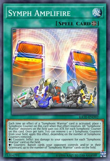 Each time an effect of a “Symphonic Warrior” card is activated, place 1 Symphonic Counter on this card when that effect resolves. All “Symphonic Warrior” monsters on the field gain 100 ATK for each Symphonic Counter on this card. Once per turn: You can remove 5 or 7 Symphonic Counters from your field; apply this effect, depending on the number of Symphonic Counters removed.