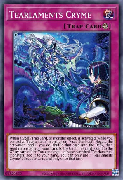 When a Spell/Trap Card, or monster effect, is activated, while you control a “Tearlaments” monster or “Visas Starfrost”: Negate the activation, and if you do, shuffle that card into the Deck, then send 1 monster from your hand to the GY. If this card is sent to the GY by card effect: You can target 1 of your banished “Tearlaments” monsters; add it to your hand. You can only use 1 “Tearlaments Cryme” effect per turn, and only once that turn.