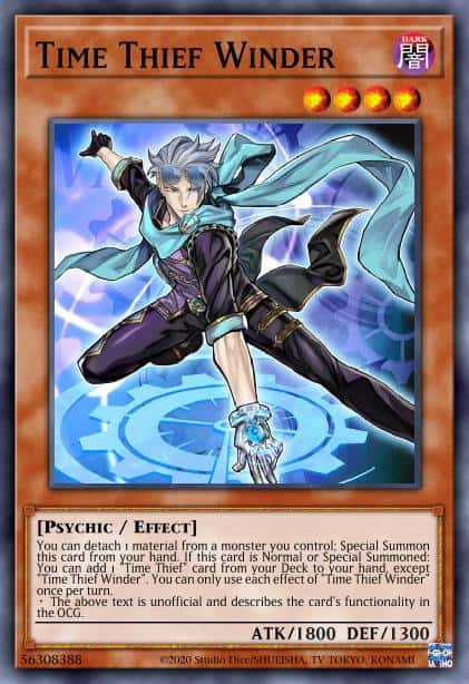 You can detach 1 material from an Xyz Monster you control; Special Summon this card from your hand. If this card is Normal or Special Summoned: You can add 1 “Time Thief” card from your Deck to your hand, except “Time Thief Winder”. You can only use each effect of “Time Thief Winder” once per turn.