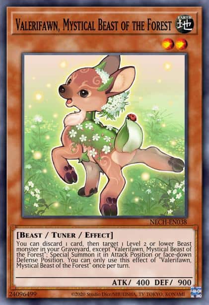 You can discard 1 card, then target 1 Level 2 or lower Beast monster in your GY, except “Valerifawn, Mystical Beast of the Forest”; Special Summon it in Attack Position or face-down Defense Position. You can only use this effect of “Valerifawn, Mystical Beast of the Forest” once per turn.