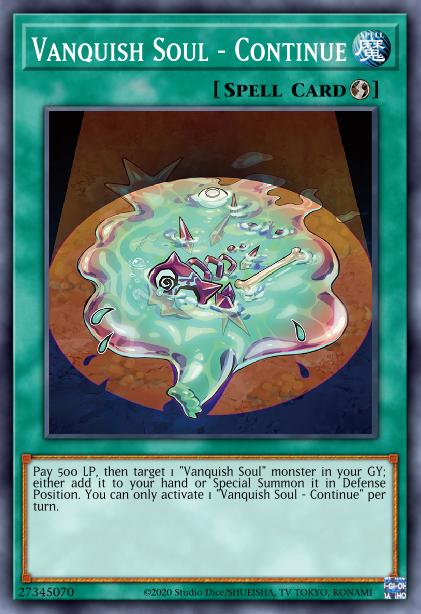 Pay 500 LP, then target 1 “Vanquish Soul” monster in your GY; either add it to your hand or Special Summon it in Defense Position. You can only activate 1 “Vanquish Soul – Continue?” per turn.
