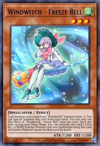 If all monsters you control are “Windwitch” monsters (min. 1): You can Special Summon this card from your hand. You can only use this effect of “Windwitch – Freeze Bell” once per turn. Once per turn, during your Main Phase: You can increase this card’s Level by 1. A WIND Synchro Monster that was Summoned using this card as Synchro Material cannot be destroyed by battle.